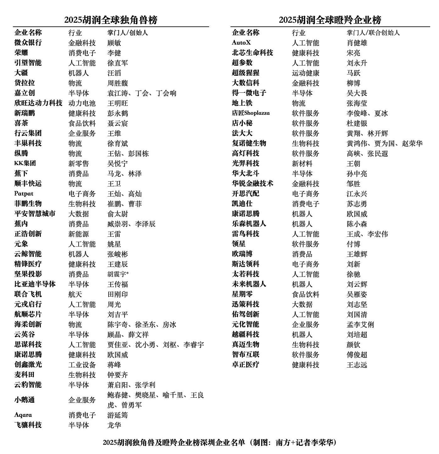 2025深圳独角兽瞪羚企业名单(胡润榜单)